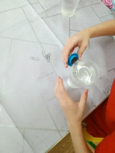 Опыт 1. Как достать скрепку из воды, не намочив рук? Для этого опыта понадобились стакан с водой, скрепка и лист бумаги. Дети аккуратно положили бумагу на поверхность воды, а затем — скрепку. После этого осторожно потянули за край бумаги: скрепка осталась плавать на воде! Ребята убедились, что можно достать предмет из воды, не прикасаясь к жидкости руками. Этот эксперимент наглядно показал силу поверхностного натяжения воды.