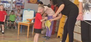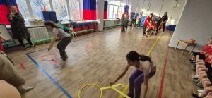 Дети и взрослые работали совместно над выполнением заданий, демонстрируя родительско-детские отношения и крепкую команду. Примером таких испытаний стала игра «Удержи равновесие», ребенок и мама должны были преодолеть дистанцию, держа вместе кубики и помогая друг другу двигаться быстрее.