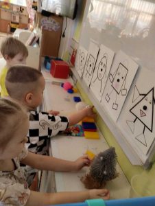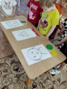 На увлекательном занятии по формированию элементарных математических представлений воспитанники второй младшей группы № 5 (педагог Голендова Т.Н.) отгадывали загадки о геометрических фигурах , обследовали и сравнивали округлые и угловатые фигуры, подбирали ,,подарки»фигуркам в соответствии с формой. Затем отправились в страну фигур . Дети получили билеты-фигурки ,преодолевали препятствие на пути-проползали под упавшим деревом (дуга),находили фигуры в соответствии с формой образца, называли цвет ,форму ,величину фигур. И с большой радостью пришли на помощь геометрическим фигурам и помогли найти перепутанные рукавички и сапожки для каждой из фигур. Занятие очень понравилось ребятам.