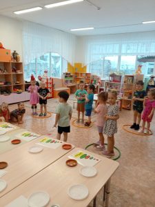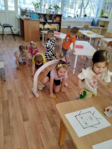 В средней группе № 10 (педагог Гретченко Н.А.) прошло увлекательное математическое приключение! Дети совместно с педагогом исследовали, что значит «внутри» и «снаружи», и ребята показали себя настоящими мастерами пространственного мышления. Сначала  поиграли в игру «Внутрь, снаружи» — на полу лежат обручи (на один меньше, чем количество детей). На сигнал: «Внутрь!» дети должны впрыгнуть в обруч (тот, кому не хватает обруча, становится водящим); на сигнал: «Снаружи» дети выпрыгивают из обручей. Один обруч убирается. Игра повторяется 2~3 раза. Все дети с интересом играли в игру. Потом перешли к рисованным заданиям: искали, кто прячется в норке, а кто гуляет снаружи. Особенно радостно было видеть, как дети помогали друг другу: если кто-то сомневался, соседи по парте объясняли свой выбор. К финалу занятия все уверенно различали эти понятия и даже придумывали собственные примеры. Это было отличное приключение и небольшой шажок в интересный мир математики!