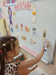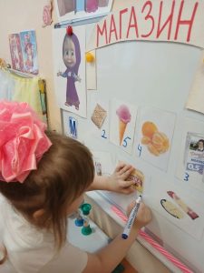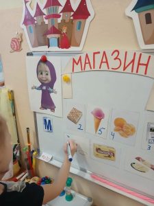 В ходе тематической недели «Я-финансист» на логопедическом занятии в старшей группе № 7 (учитель-логопед Серёгина О.В.)  дети решили отправиться в магазин за продуктами. Сперва вместе с продавцом Машей расставили товар на полках, при этом выбирали только те продукты, названия которых начинаются на звук М. Затем ребята вспомнили, что у каждого товара должен быть ценник. Цену товара мы узнали, разделив слова на слоги (мо-ло-ко, ма-ка-ро-ны и т.д.). Сколько в слове слогов, такой ценник мы написали на каждом продукте. Поговорили о том, откуда у родителей берутся деньги, на какие нужды нужно тратить деньги в первую очередь, как приобрести  любимую профессию в будущем и зарабатывать больше денег. Представляя себя покупателями и выбирая желаемый товар, каждый ребенок определял, сколько денег (рублей) ему нужно взять. В результате у детей закреплялись математические представления о счете и составе числа. В заключение дети играли в игры «Что приготовим из этих  продуктов?», «Что лишнее?»